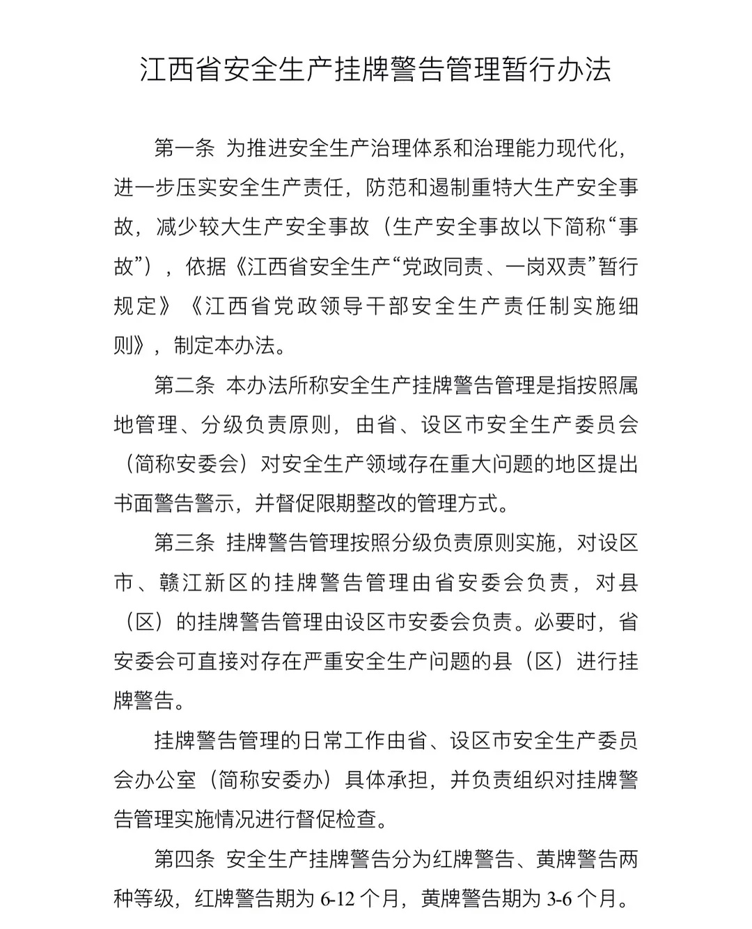 為深入貫徹習近平總書記關于安全生產重要論述,進一步壓緊壓實地方各級黨政領導安全生產責任,持續(xù)推動我省安全生產領域改革發(fā)展。省安委辦依據(jù)《安全生產法》《江西省安全生產條例》《江西省黨政領導干部安全生產責任制實施細則》《江西省安全生產“黨政同責、一崗雙責”暫行規(guī)定》等法律法規(guī)和政策文件規(guī)定,在廣泛調研和征求意見的基礎上,牽頭起草了《江西省安全生產掛牌警告管理暫行辦法》(以下簡稱《辦法》),并于近日以省安委會名義印發(fā)。